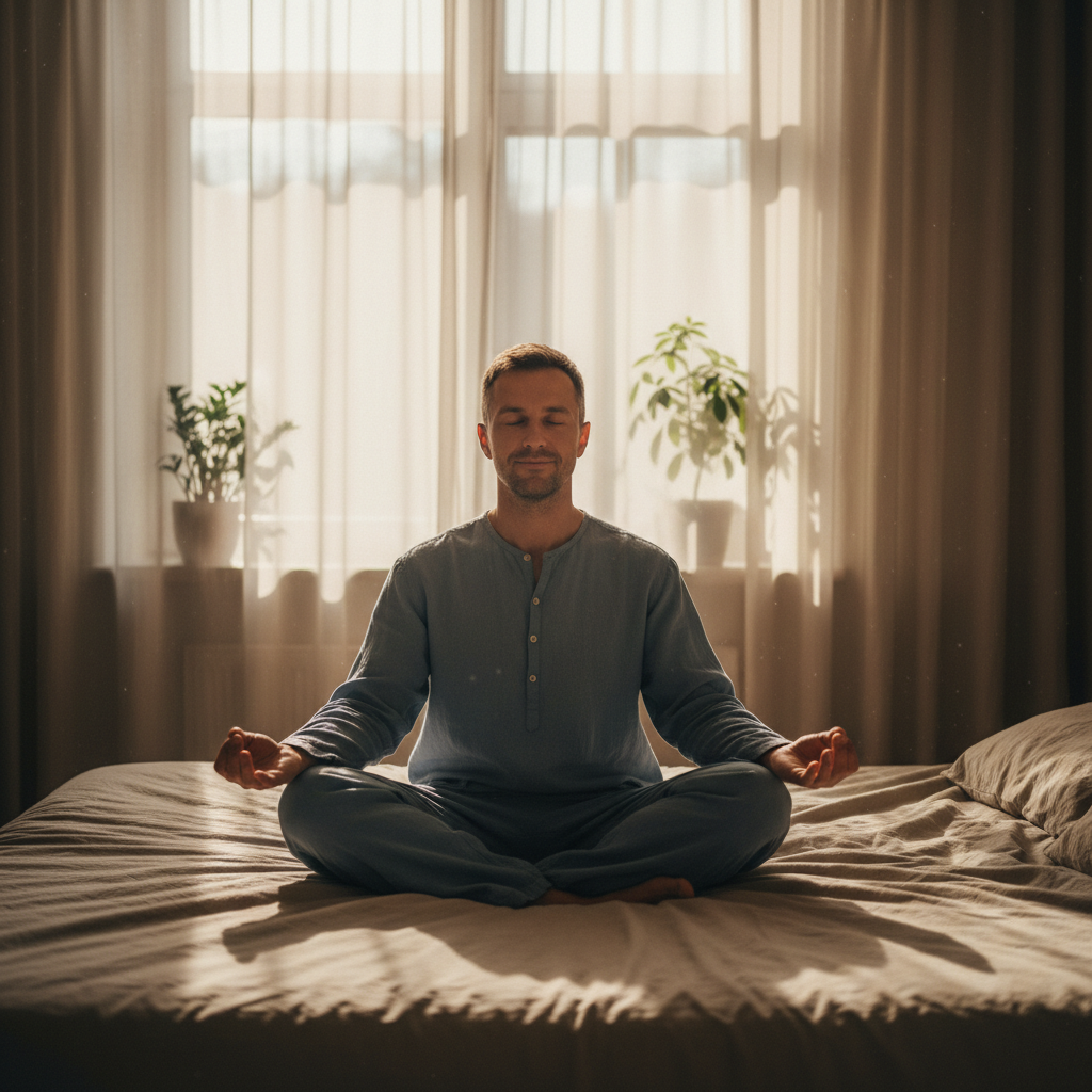 Não precisa virar um monge. Apenas 3 minutos de respiração diafragmática (inspirar em 4 segundos, segurar 4, expirar em 6) ativam o nervo vago. Isso tira você do estado simpático (luta/fuga) e te joga no parassimpático (descanso/digestão).
